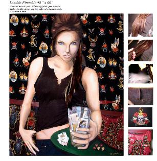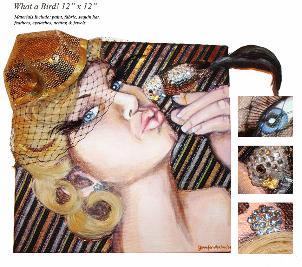 patterned fabrics, jewelry, clothing, fur and hair, giving three dimensions to the large acrylic paintings