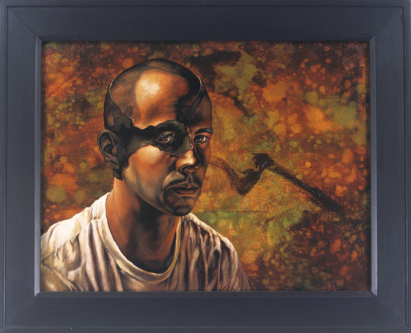 MAN WITH BLACKEYE, LISTENING, oil/gold leaf on canvas, 32h x 39w, 2003, Collection of the Mobile Museum of Art