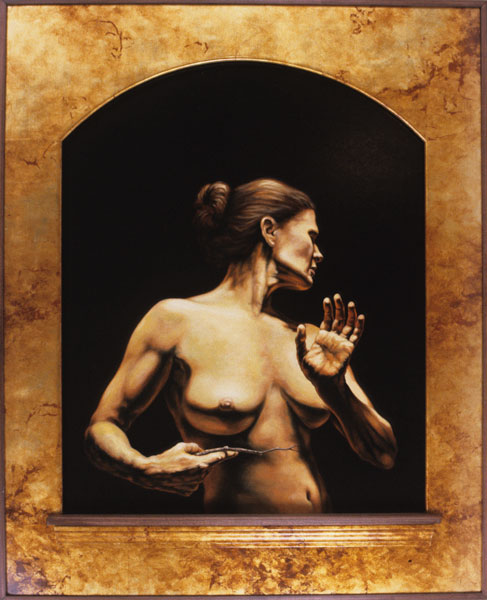 WOMAN WITH RIGHT ARM, oil/gold leaf on canvas, 46h x 59w, 2001