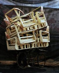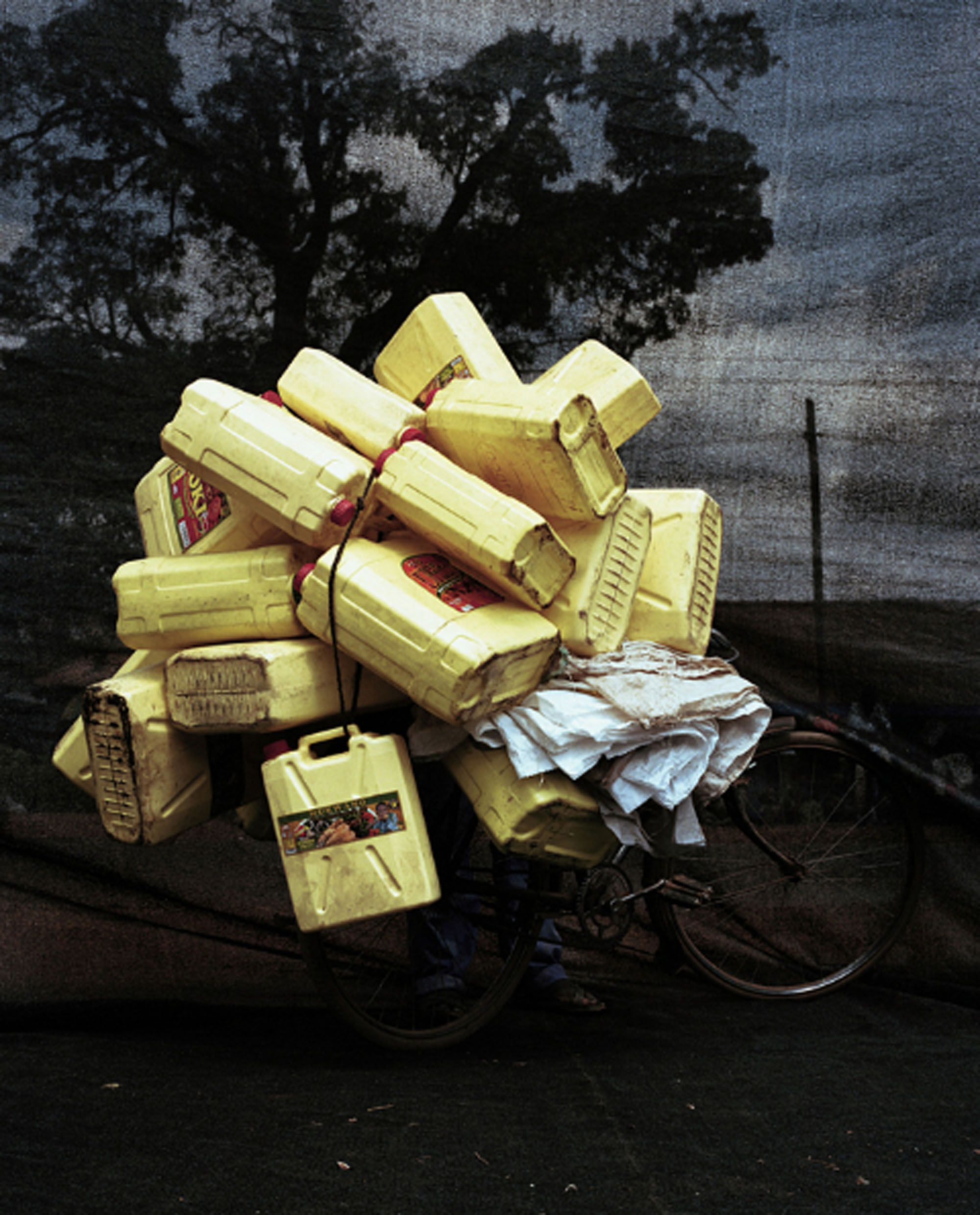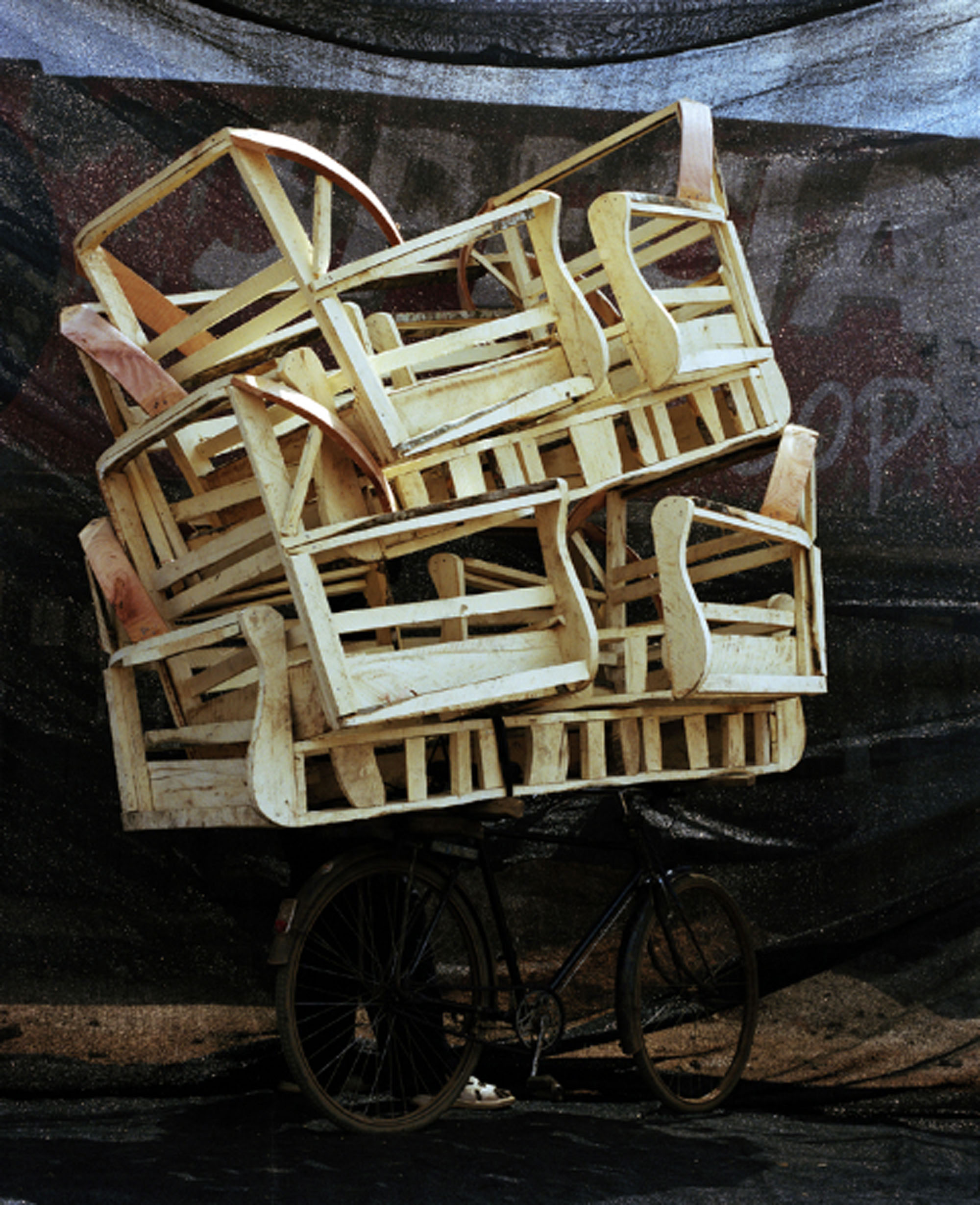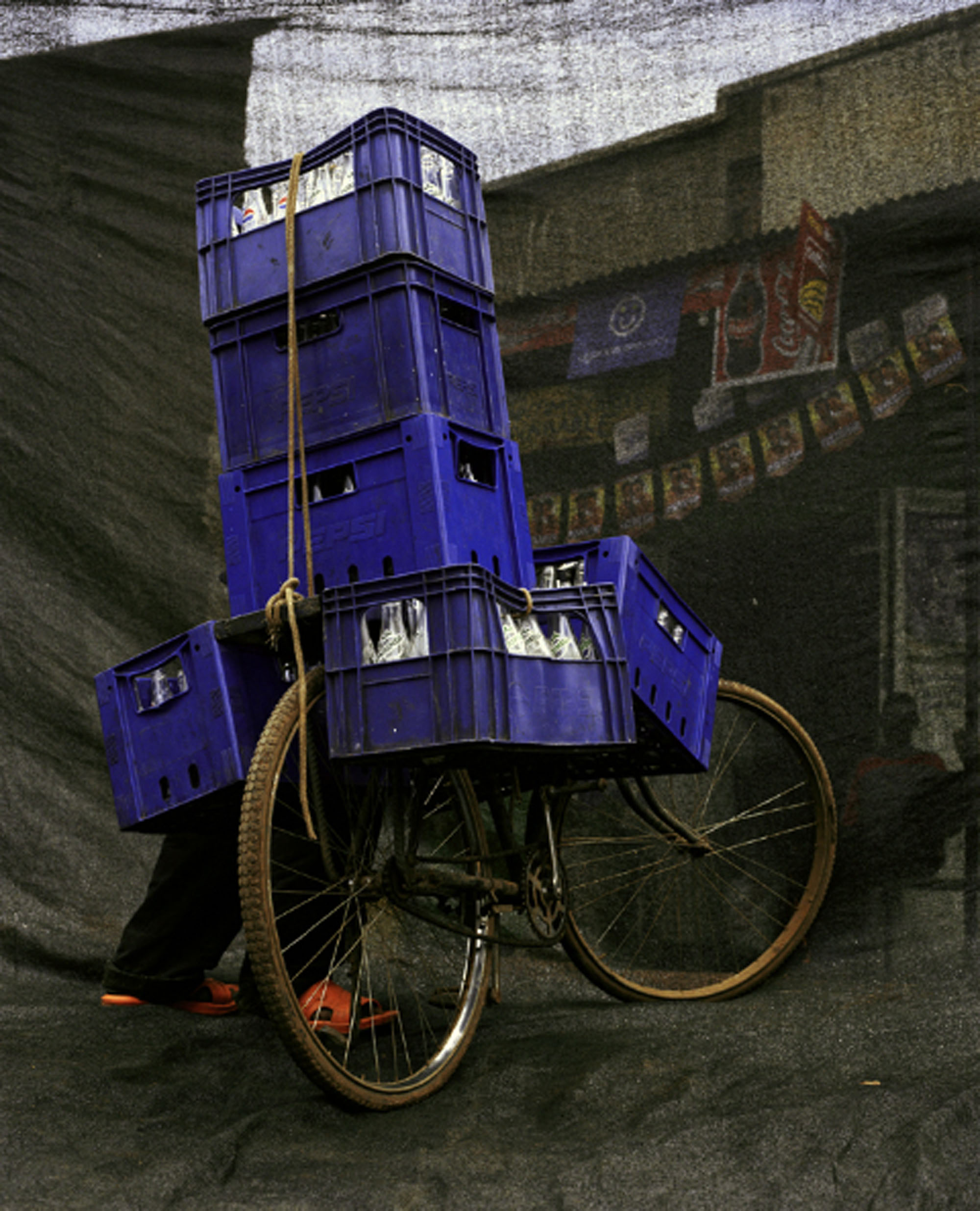 environment. The back drop stages and propels the subject matter (men with bikes and a towering cache of merchandise) to